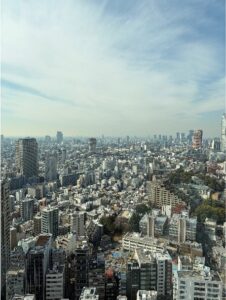 この写真は、東京タワーのメインデッキから眺めた景色です。メインデッキは、高さ333mの東京タワーに対し、高さ150mの所にある展望台です。東京の街並みを遠くまで見渡せ、心がすっと軽くなるひとときを味わえました。