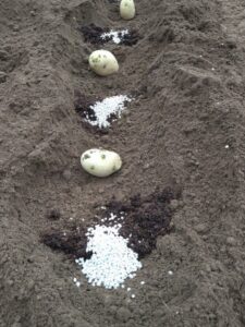 畝幅60~70cmの真ん中に深さ10cm程度の溝を掘り、30cm間隔に種イモを置いたあと、種イモと種イモの間に肥料(堆肥と化成肥料を1握り程度)を置きます。