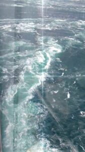 さらに南へ南へと向かい、今度は大鳴門橋まで。こちらも海と橋の景観は圧巻で、かの鳴門海峡の「うずしお」を観光。「うずしお」の発生は偶発的なもので、時期(大潮・小潮)や時間帯(満潮・干潮)によってかわるらしく、パンフレットで見るような「うずしお」までは遭遇しなかったけど、潮と遊覧船の風景やちっちゃな「うずしお」でも十分満足できました。