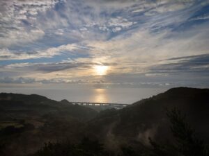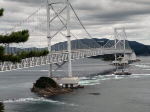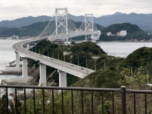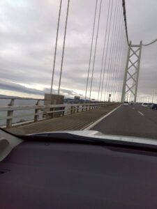 翌日は神戸市から明石海峡大橋を渡り、淡路島へ。あいかわらず空はどんよりしてましたが、広がる海と橋の景観は圧巻で、おもわず「写真!写真!」と家族へお願いし車中からパチリパチリ。