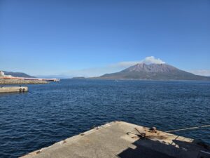 澄み切った青空が印象的な秋晴れのある日。垂水市への旅は、フェリーから始まりました。目の前には見慣れたはずの桜島。なのに、つい、カメラを向けてしまうのは、その偉大さに心打たれるからなのでしょうか。