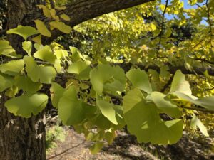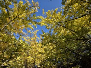 澄み切った秋の青空を背景に広がるイチョウの葉は、太陽の光を浴びて透けるような黄金色。しかし、その黄金の合間には、まだ力強い緑色も残っていました。