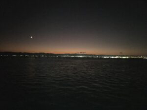 船の推進に呼応する波音は前に進む力強いリズムのようで、暮れ行く海の上で充実感を持って小さな旅が終わりました。